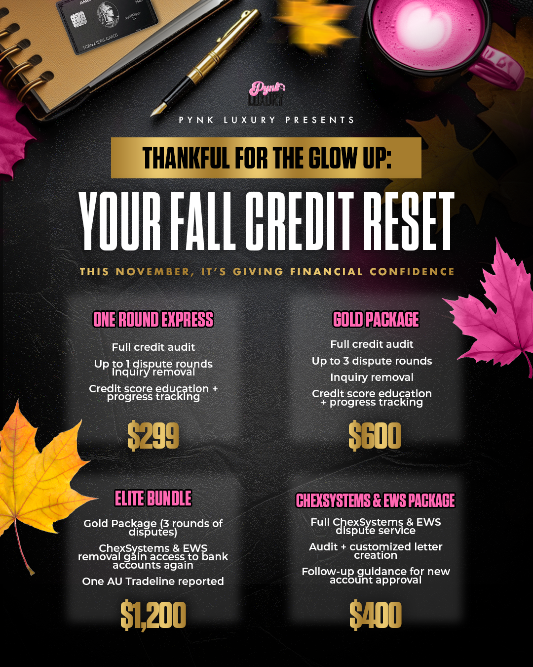 At Pynk Luxury, our mission is to guide you through the journey of improving your credit score and gaining financial freedom. Whether you're looking to repair past credit challenges, boost your credit score, or simply understand your credit better, we're here to support you every step of the way.
